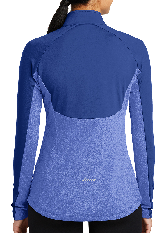 By mixing heather with a solid color and adding reflective hits, this moisture-wicking pullover has a technical look plus plenty of stretch for easy movement.